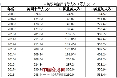 上表显示,2007年中国赴美40万人次,2018年达290万人次,增长了7.3倍。同期,美国来华从171万增长到约230万人次,增长了1.3倍。2015年前,美国来华一直人数多于中国赴美人数,2015年起中国赴美人次开始超过美国来华人次。